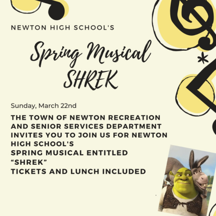 Join us for Newton High School's Spring musical, "Shrek". Lunch will be served at Noon in the NHS cafeteria. Musical begins at 2PM. Reservations are required. This event is for Newton residents 55 & older.