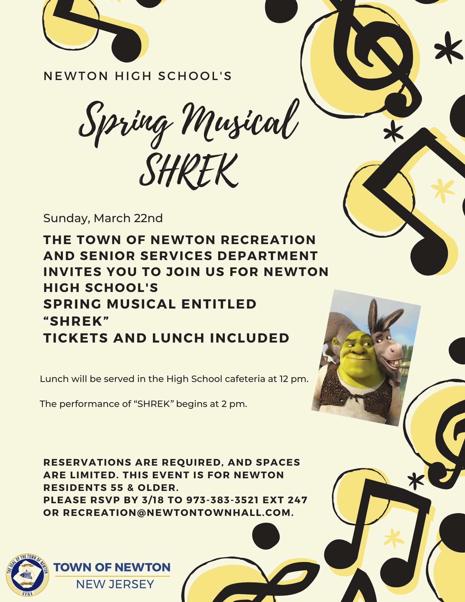 Join us for Newton High School's Spring musical, "Shrek". Lunch will be served at Noon in the NHS cafeteria. Musical begins at 2PM. Reservations are required. This event is for Newton residents 55 & older.